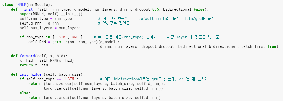 Q. 이 코드에서 word_dim * word_dim인 이유는? W는 차원을 맞춰주려고 h든 t든 모두 square matrix이기 때문. 코드로는 nn.Linear(word_dim, word_dim)