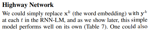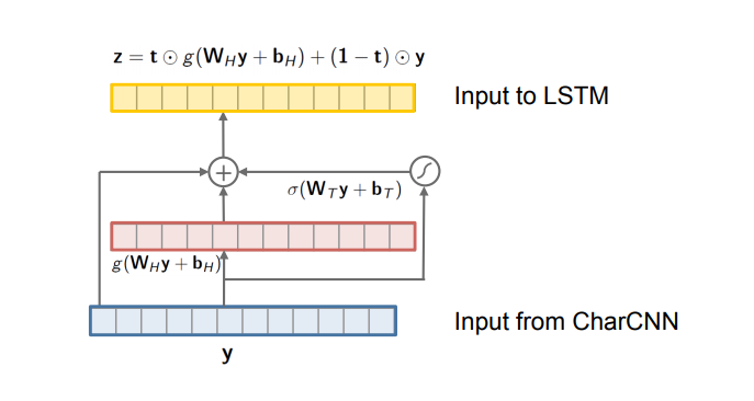 3. Highway Network | 다른 논문에서는 x였던 것을 여기에서는 CharCNN의 output값인 y를 넣어준다. 1) y를 받아서 affine transformation W_(T) * y + b_(T) 연산을 해준다. (임베딩 행렬 x 인풋 + 바이어스) 2) 1)의 결과값에 Sigmoid를 씌운다. 이 값이 transform gate t가 된다. 3) 2)의 값과 ReLU(W_(H) * y + b_(H))를 element-wise product를 해준다. 4) 다음으로 (1 - t) 즉, 숫자 1에서 2)의 결과값을 빼준다. 이게 carry gate이다. 5) 4)번의 carry gate와 y를 곱해준다. 6) 마지막으로 3)의 값과 5)의 값을 더해서 LSTM으로 보낸다. - 위의 W_(T)와 W_(H)는 모두 연산의 편리성을 위해 square matrix(정방 행렬)이며, 파이토치 코드로는 nn.Linear(dim, dim)이 된다. - Highway Network의 bias들은 -2 (마이너스 2)로 들어감 - 레이어의 개수는 2개가 좋다. 그 이상으로 늘려도 더 효과가 없음 - 이 논문에서 Highway network는 semantic features를 아는 것 같다고 함 (character-level input을 더 의미있게 만들어줌. 왜냐하면 여기를 통과하기전 상태에서는 단어의 외부적인 모습 --you, your, young 등등--을 인식한 모습을 보여주는데, Highway를 통과한 이후에는 you, we 같은 semantic한 것들도 잡아내기 때문. 이는 통과하기 전과 통과한 후에 Nearest Neighbor를 적용해서 체크했다) - Ax + b 형태의 수식 자체가 affine transformation이다. Ax는 그냥 선형이고, b가 있어야 affine transform. |