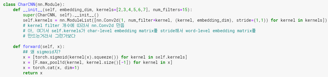 | 2. CharCNN | 1) CNN 코드상의 kernel width w = [1,2,3,4,5,6,7] (large model 기준, small model은 1~6까지만)이고 height는 15-dim이다. hidden 수는 [50,100,150,200,200,200,200] 2) 각 Convolution 마다 max값을 취하고, 그렇게 한 번 stride 하고 tanh를 적용시켜주고 나면, 첫번째 필터에 대한 max값들의 모음인 vector 하나가 나온다. 이 vector의 max값을 다시 취한다. 3) max값끼리 concatenate를 한다. 이렇게 나온 벡터가 뒤의 Highway Network의 input이 된다.  |