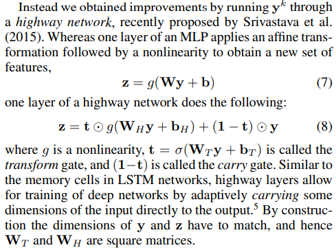 2. CharCNN | 1) CNN 코드상의 kernel width w = [1,2,3,4,5,6,7] (large model 기준, small model은 1~6까지만)이고 height는 15-dim이다. hidden 수는 [50,100,150,200,200,200,200] 2) 각 Convolution 마다 max값을 취하고, 그렇게 한 번 stride 하고 tanh를 적용시켜주고 나면, 첫번째 필터에 대한 max값들의 모음인 vector 하나가 나온다. 이 vector의 max값을 다시 취한다. 3) max값끼리 concatenate를 한다. 이렇게 나온 벡터가 뒤의 Highway Network의 input이 된다. |