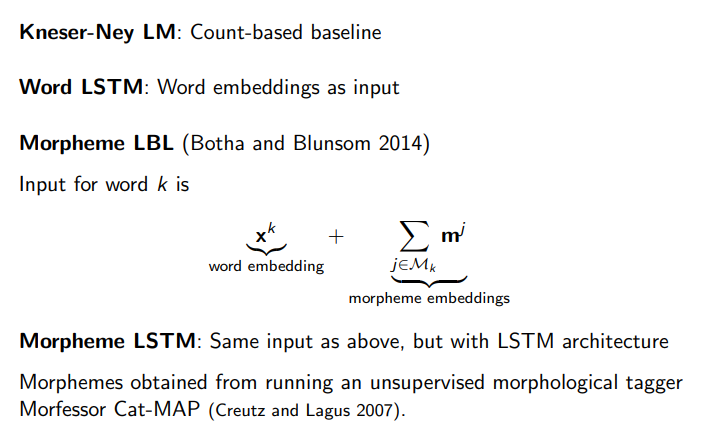 1. Preprocessing 단계 | 데이터셋은 언어별로 다르며, 영어의 경우 Penn Tree Bank 데이터셋 (Mikolov가 전처리한 버전, vocabulary size가 10K) 사용 3종류의 embedding matrices를 사용 1) character-level embedding matrix (input으로 들어갈땐 word 형태로 들어감, 이 논문의 contribution) 2) word-level embedding matrix (비교를 위해서) 3) morpheme matrix (prefix(접두사) + stem(어간) + suffix(접미사)) + word-level embedding matrix 여기서 3)번의 morpheme matrix는 morphemes를 얻기 위해서 Morfessor Cat-MAP(Creutz and Lagus 2007, unsupervised morphological tagger)을 썼다고 함. |