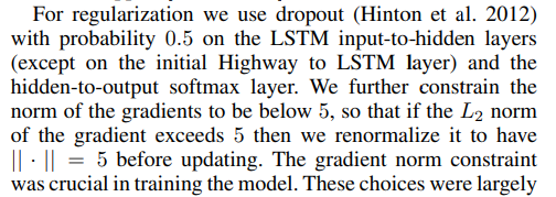 요약본 - epoch은 아랍어가 아니라면 25번, 아랍어만 30번 - 백프로파게이션은 35 time steps만 진행 (코드로 보면 sentence 길이가 35가 넘어가면 자름) - Learning rate는 1로 시작해서 0.5 weight decay - 모델의 파라미터들은 [-0.05, 0.05]의 uniform distribution으로 random initialization - drop out = 0.5 (다만 Highway network -> LSTM으로 최초로 갔을땐 dropout 적용을 안 함) - Gradient norm = 5 (5가 넘어가면 다시 5로 renormalization) - Hierarchical Softmax는 데이터 사이즈를 키웠을때 (DATA-L)에만 적용해주었다. DATA-S 상태에서는 효과가 없었다 |
