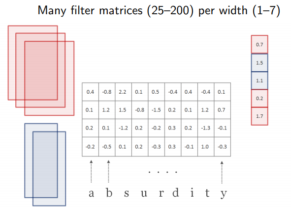 H : filter (=kernel), H ∈ R^(d x w) | w = conv filter의 width. w = [1,2,3,4,5,6,7] (large 기준) d x w 즉, [15 x 1], [15 x 2], [15 x 3], [15 x 4], [15 x 5], [15 x 6], [15 x 7]의 H 커널 매트릭스가 모든 단어에 대해 곱해짐. 이때 Frobenius inner product를 썼다고 되어 있는데, 2차원에서는 element-wise product와의 차이를 모르겠음. |