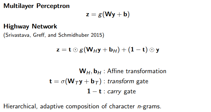 | 3. Highway Network | 다른 논문에서는 x였던 것을 여기에서는 CharCNN의 output값인 y를 넣어준다. 1) y를 받아서 affine transformation W_(T) * y + b_(T) 연산을 해준다. (임베딩 행렬 x 인풋 + 바이어스) 2) 1)의 결과값에 Sigmoid를 씌운다. 이 값이 transform gate t가 된다. 3) 2)의 값과 ReLU(W_(H) * y + b_(H))를 element-wise product를 해준다. 4) 다음으로 (1 - t) 즉, 숫자 1에서 2)의 결과값을 빼준다. 이게 carry gate이다. 5) 4)번의 carry gate와 y를 곱해준다. 6) 마지막으로 3)의 값과 5)의 값을 더해서 LSTM으로 보낸다. - 위의 W_(T)와 W_(H)는 모두 연산의 편리성을 위해 square matrix(정방 행렬)이며, 파이토치 코드로는 nn.Linear(dim, dim)이 된다. - Highway Network의 bias들은 -2 (마이너스 2)로 들어감 - 레이어의 개수는 2개가 좋다. 그 이상으로 늘려도 더 효과가 없음 - 이 논문에서 Highway network는 semantic features를 아는 것 같다고 함 (character-level input을 더 의미있게 만들어줌. 왜냐하면 여기를 통과하기전 상태에서는 단어의 외부적인 모습 --you, your, young 등등--을 인식한 모습을 보여주는데, Highway를 통과한 이후에는 you, we 같은 semantic한 것들도 잡아내기 때문. 이는 통과하기 전과 통과한 후에 Nearest Neighbor를 적용해서 체크했다) - Ax + b 형태의 수식 자체가 affine transformation이다. Ax는 그냥 선형이고, b가 있어야 affine transform.  |