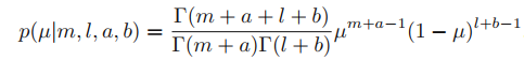 앞에서 보았던 Beta의 mean인 E[μ]=a/a+b와 normalization coef.인 m, l을 넣으면 아래와 같은 수식이 나온다.