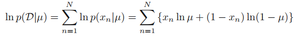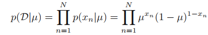 이제 데이터셋 D = {x1, ... , xN}이 변수 x에 대해서 관측된 값들이고, μ에 대한 함수 p(x|μ)로부터 i.i.d하게 그려진다고 가정하고 likelihood function을 만들어보자.