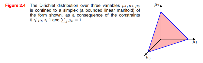 summation constraint 때문에 {μ_(k)} space에서의 distribution은 K-1 차원을 갖는 simplex이다.