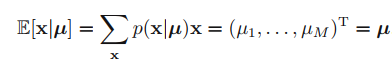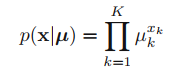 μ_(k)를 써서 x_(k)=1의 확률을 나타낸다면, x의 distribution은 아래와 같다.