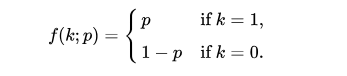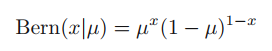 x 전반에 대한 probability distribution은 아래와 같이 쓸 수 있으며, Bernoulli distribution (베르누이 분포)이라고 한다.