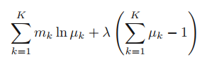 그리고 μ_(k)에 걸린 constraint (합이 1이 되어야 한다)를 만족하면서, μ를 위한 maximum likelihood solution을 찾기 위해서 Lagrange multiplier를 쓴다.