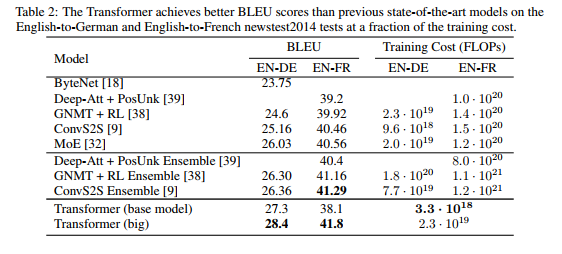 WMT 2014 영어-독일어 번역 태스크에서, 대형 트랜스포머 모델 (테이블2의 Transformer (big))은 이전에 발표된 최고의 모델들 (앙상블 포함)을, 28.4의 새로운 SOTA BLEU 스코어를 기록하면서, 2.0 BLEU 이상 뛰어넘었다. 모델의 구성은 테이블 3의 최하단 라인에 리스트되어 있다. 8개의 P100 GPU들로 3.5일간 트레이닝을 했다. 기본 모델조차, 경쟁 모델 학습 비용의 일부만으로, 이전에 발표된 모든 모델들과 앙상블들을 뛰어넘었다.