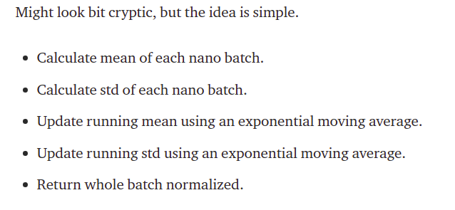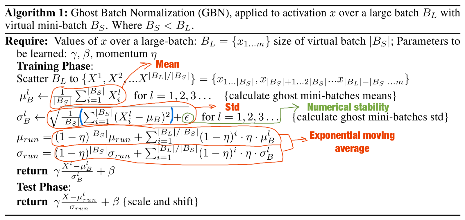 - "generalization gap"이라고 부르는 현상, 즉 배치사이즈가 클 때, 본 적이 없는 데이터에 대해서 더 나쁘게 동작하는 것을 해결하기 위해서 나왔다. (Batch Normalization은 인풋 데이터를 0 mean, 1 std. dev.로 노말라이즈 함)