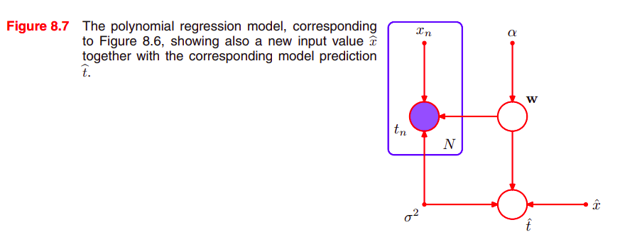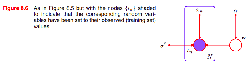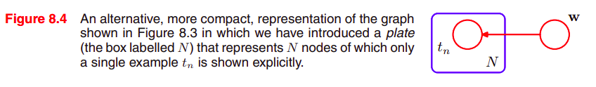 모델의 파라미터와 랜덤 변수 stochastic variables를 명시적으로 나타내는게 도움이 될 때도 있다. 그래서 수식 (8.6)을 다시 적어보면, 아래와 같이 나타낼 수 있다.