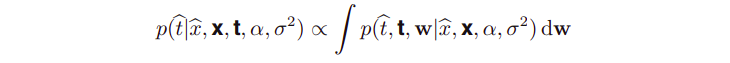 새로 들어온 input value인 t_hat에 대한 predictive distribution을, 확률의 sum rule로부터, 모델 파라미터 w를 통합하는 것으로 얻어낸다.