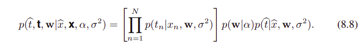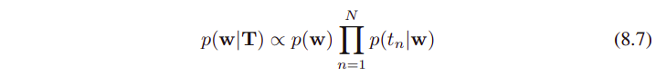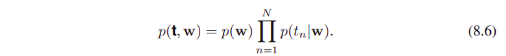 모델의 파라미터와 랜덤 변수 stochastic variables를 명시적으로 나타내는게 도움이 될 때도 있다. 그래서 수식 (8.6)을 다시 적어보면, 아래와 같이 나타낼 수 있다.