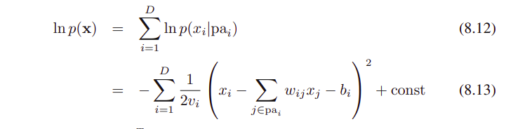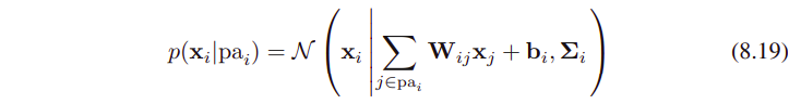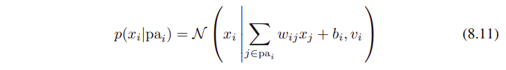 각 x_i (부모 노드의 states에 conditional)는 수식 (8.11)처럼 Gaussian distribution이다.