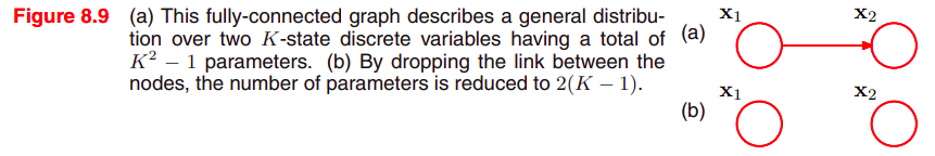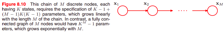 이처럼 graphical 관점에서 볼 때, 그래프상에서 link를 없애는 것으로 파라미터의 개수를 줄일 수 있다. M개의 변수들을 가진 그래프가 fully connected라면 파라미터 개수는 K^(M) - 1이 된다. (링크가 없다면 위에서처럼 M(K - 1))