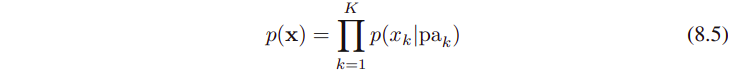 그래프에 의해 정의되는 joint distribution은 product로서 주어진다. 각 노드의 conditional distribution은 그래프에서 해당 노드의 parents 노드들에 conditioned하다. 따라서 K개의 노드들로 이루어진 그래프의 joint distribution은...