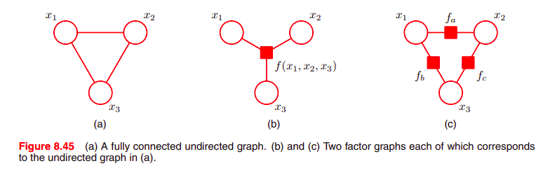 여기서 체크할 것은 같은 undirected graph에 대응하는 몇 개의 다른 factor graph가 있을 수 있다는 것이며,