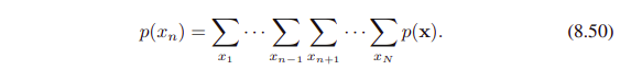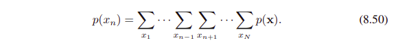 정의에 따라, marginal은 $x_n$을 제외한 모든 variables의 joint distribution을 sum하는 것이다. 아래의 수식을 보면 $x_n$은 없는 걸 볼 수 있다.