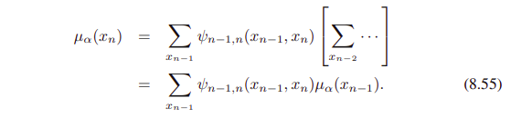 - $\mu_\alpha$가 노드 $x_(n-1)$에서 시작해서 노드 $x_n$으로, messages를 forward로 보내며