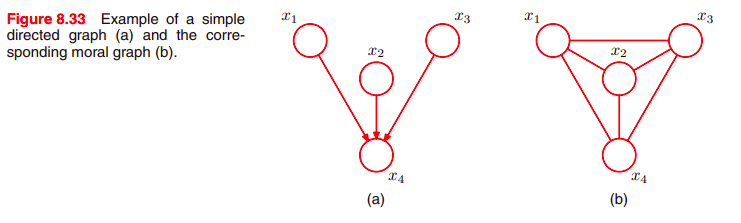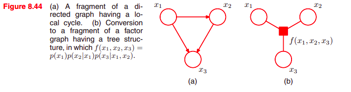 factor graph로 바뀔 때 사라진다. 하단 figure (8.44)에서 보이다시피, 적합한 factor function이 정의되기 때문이다.
