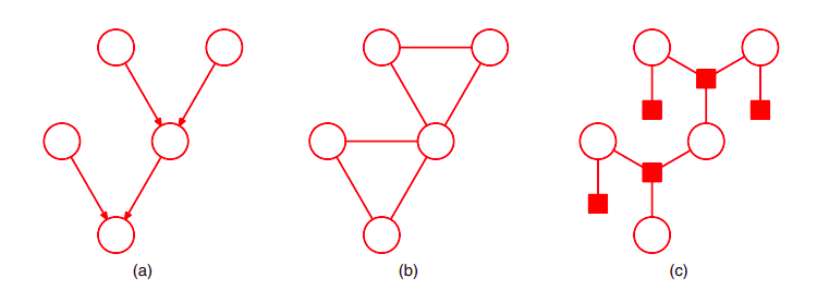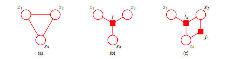 (c)는 (b)보다 더 세부적인 factorization, $p(x) = f_a(x_1, x_2)f_b(x_1, x_3)f_c(x_2, x_3)$를 보이며,