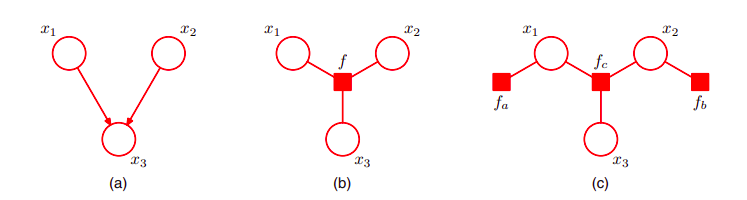 (c)는 $f_a(x_1) = p(x_1), f_b(x_2) = p(x_2)$와 $f_c(x_1, x_2, x_3) = p(x_3 | x_1, x_2)$를 나타낸다.