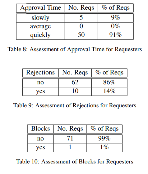 또한 워커들은 72 리퀘스터 중 10명으로부터 rejections을 경험했다. 이 중 3명은 2%보다 낮은 비율을 보였지만, 4명의 리퀘스터는 25%를 넘는 rejections를 보였다. 이는 워커들이 리퀘스터와 함께 일할지를 결정하는데에 경종을 울린다.