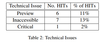 리퀘스터가 본인이 원한 결과물을 얻는 것에, 테크니컬과 작업 설명서 이슈가 크게 작용했다. inaccessible과 critical 이슈들도 워커들이 HIT을 완료하는 걸 어렵게 했다. 불완전한 설명서는 예기치 못한 형태로 작업을 끝내게 했는데, 모든 HIT 중 30%가 여기에 해당되었다.