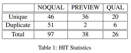 3개 카테고리(NOQUAL, PREVIEW와 QUAL)의, 총 161개의 HITs를 했다. 몇몇개의 HITs는 같은 거지만 다른 날에, 다른 보수로 릴리즈되었었다. 만약 이름까지 같다면 duplicates로 넣었다.