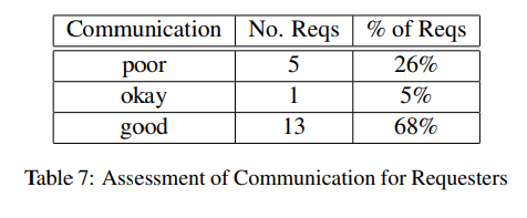 19명의 리퀘스터에 대해 커뮤니케이션 스코어를 매긴 아래 테이블을 보면, 26%의 리퀘스터가 커뮤니케이션이 원활하지 못한 것으로 나타났다.