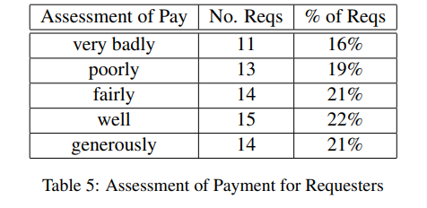 HIT의 리퀘스터를 워커들이 리뷰할 수 있었다. 아래 테이블은 총 79 중, 67명의 리퀘스터들의 보수 평가에 대한 워커들의 리뷰이다. 43명의 리퀘스터들이 괜찮음(fairly, well, generously) 이상의 평가를 받았고, 나머지는 짜거나 너무 적게 준다는 평가를 받았다.