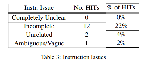 작업 설명서를 떠올려 볼 때, 몇몇 HITs는 불명확한 설명이 있었고, 12개의 HITs는 불완전한 설명이었다. 워커들이 작업을 하기에 어려웠을 것으로 보이며, 관련이 없거나 애매한 설명들 역시 같은 결과를 빚었다. 총 HITs의 27%인 15개의 HITs가 그러했고, 테크니컬 또는 작업 설명서 이슈가 있었던 HITs는 30%에 달하는 17개의 HITs였다. (한개는 테크니컬과 설명서 이슈 모두 있었다)