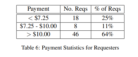아래 테이블4는 TurkerView의 워커 피드백에 기초하여 본, HITs가 지급한 시간당 평균 달러 액수이다. 102개의 최근 HITs 중 54개에 대한 내용이다. 워커가 받은 금액을 HIT를 하는데 쓴 시간에 맞춰 나눈 것이다. 44%에 달하는 24개의 HITs가 시간당 7.25달러보다 낮은 금액을 지급했으며, US Federal의 최저 시급보다 낮은 금액이다. 17%인 9은 7.25와 10달러 사이를 받았고, 39%인 21명이 10달러보다 낮은 시급을 받았다.