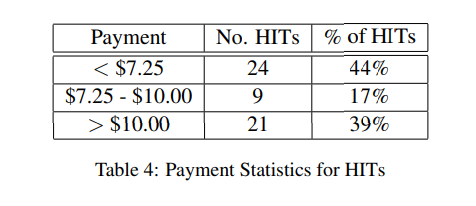 AMT에서의 워커들의 평균 급여는 1시간에 3.13 달러 정도인데, 리퀘스터는 보통 시간 당 11.58 달러의 비용을 지불한다. 이렇게 차이나는 이유는 대부분의 HITs가 낮은 비용을 주기 때문이다. (이 논문을 쓴) 연구자들은 AMT 워커들이 조금만 일하고자 했고, 보상의 크기는 데이터 퀄리티에 별 영향을 주지 못했을거라 믿었다.