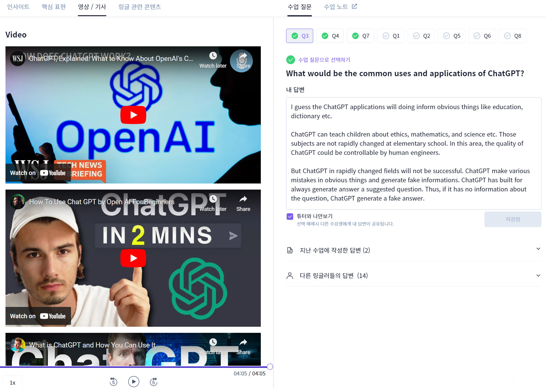 우선 전체 질문들에 대해서 답변을 할 수 있고, 그 다음으로 전체 답변들에 대해서 튜터로부터 피드백을 받을 수 있기 때문이다. 교재 하나에 대해서 개인적으로 경험할 수 있는 모든것을 체험하게 된달까.