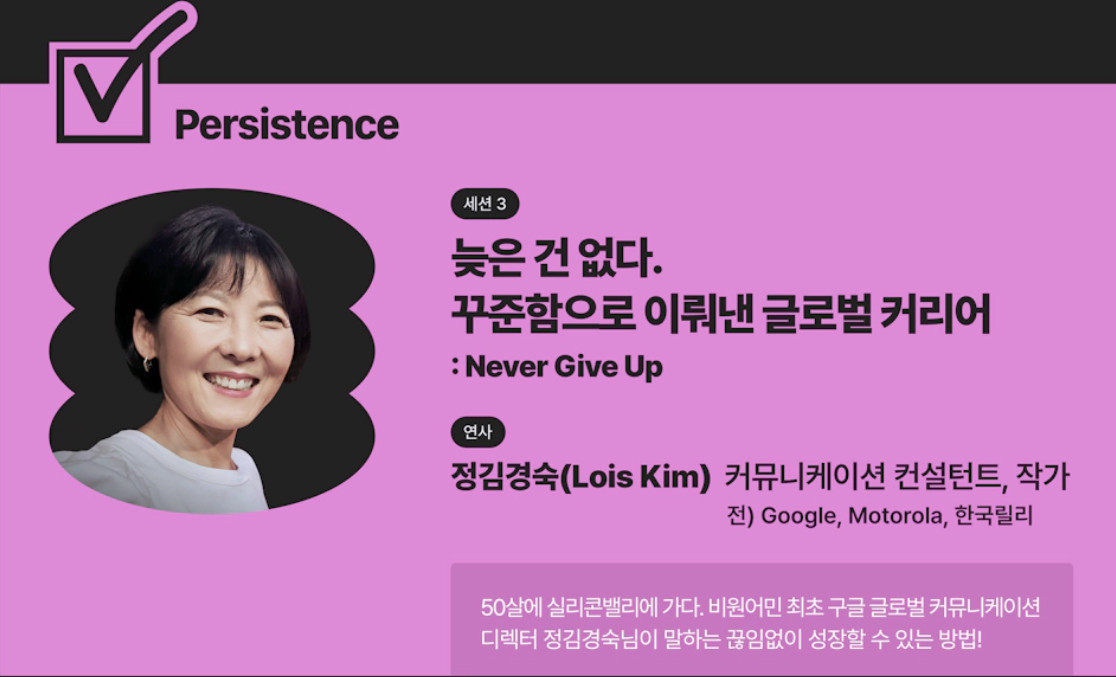 5분의 연사분들 중에서 개인적으로 'Lois Kim' 한국이름으로는 정김경숙이라는 분이 가장 눈에 확 들어왔다.